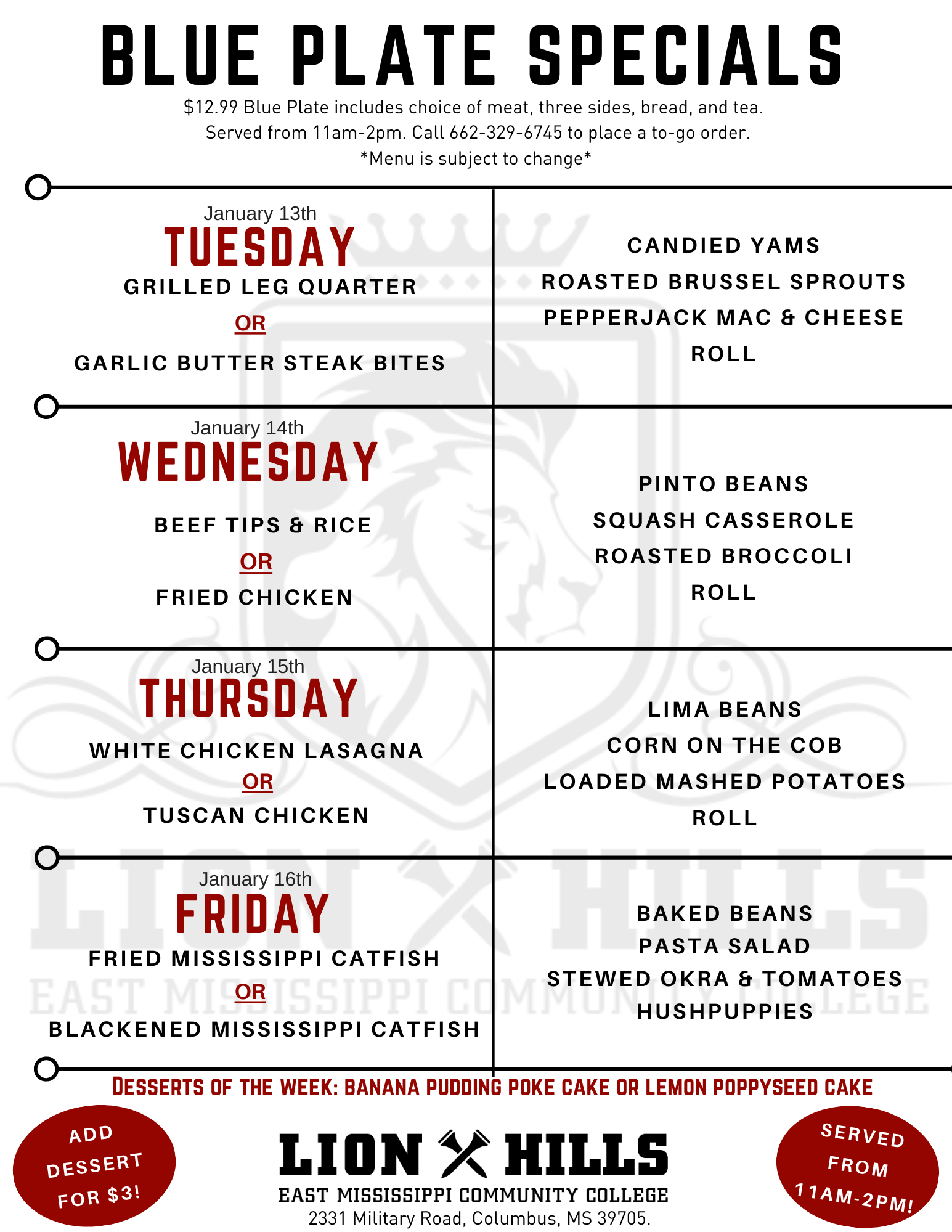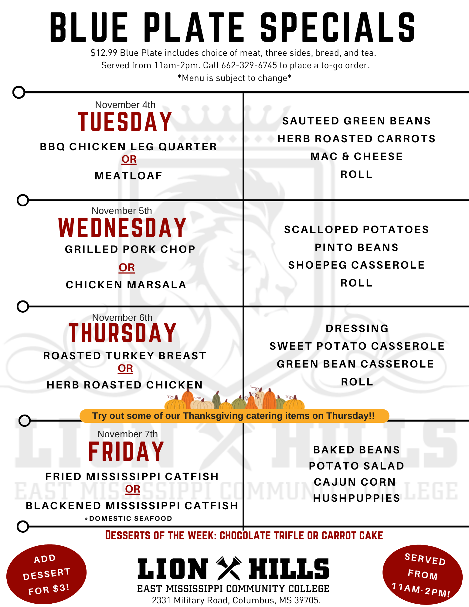 Every week, Monday through Friday, Lion Hills offers a blue plate special. We are open to the public, so feel free to swing by with your friends and co-workers and dine with us. Our chefs create a new menu each week so our local civic groups and guests can enjoy a variety of flavors from around the world. Our menu also regularly features southern style fried chicken, and catfish. Our lunch hours are from 11:00am to 2:00pm, so please drop by and join us.